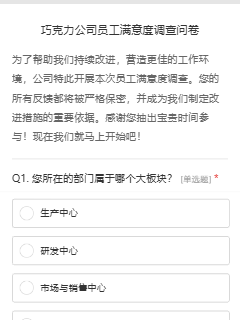 为持续提升企业管理水平,营造更佳的工作氛围,促进公司与员工的共同成长,人力资源部特开展本次匿名问卷调查。您的真实想法对我们至关重要,本问卷完全匿名,请放心作答。感谢您的积极参与!现在我们就马上开始吧!