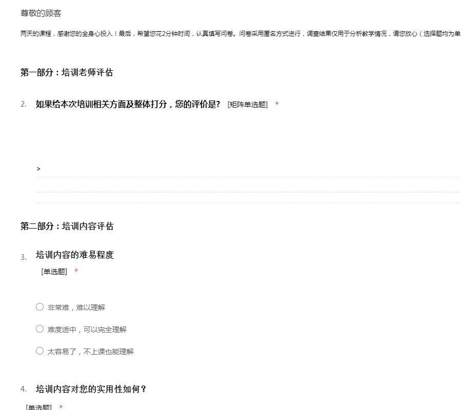 1天半的课程,感谢您的全身心投入!最后,希望您花2分钟时间,认真填写问卷。问卷采用匿名方式进行,调查结果仅用于分析教学情况,请您放心(选择题均为单选题)。