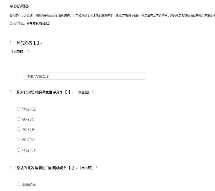 各位同仁,大家好!感谢您参加本次的培训课程。为了解您对本次课程的满意程度,请您尽可能地准确、详尽填写以下的问卷,您的意见和建议有助于我们不断地完善培训课程及培训体系。以下您所提供的信息仅会应用于此。非常感谢您的配合!