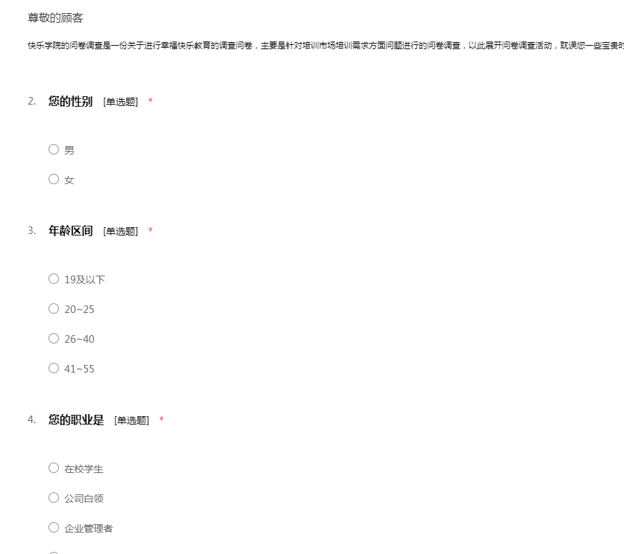 快乐学院的问卷调查是一份关于进行幸福快乐教育的调查问卷,主要是针对培训市场培训需求方面问题进行的问卷调查,以此展开问卷调查活动,耽误您一些宝贵时间,回答快乐学院问卷调查,谢谢您的合作。