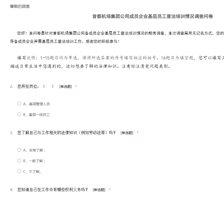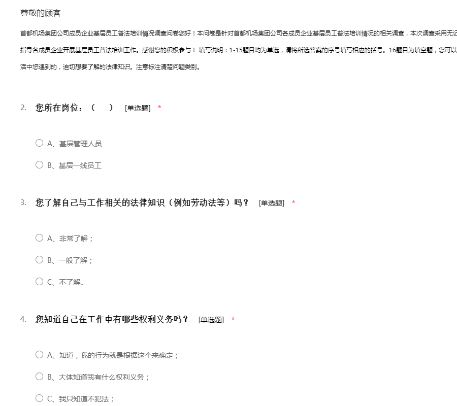 首都机场集团公司成员企业基层员工普法培训情况调查问卷(站坪)