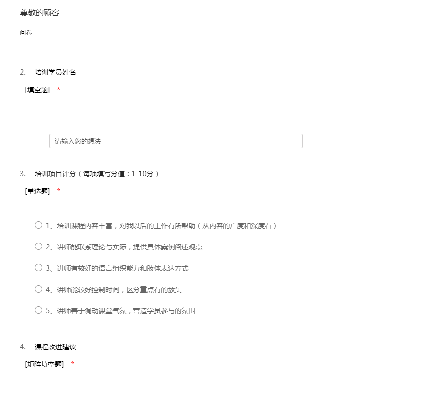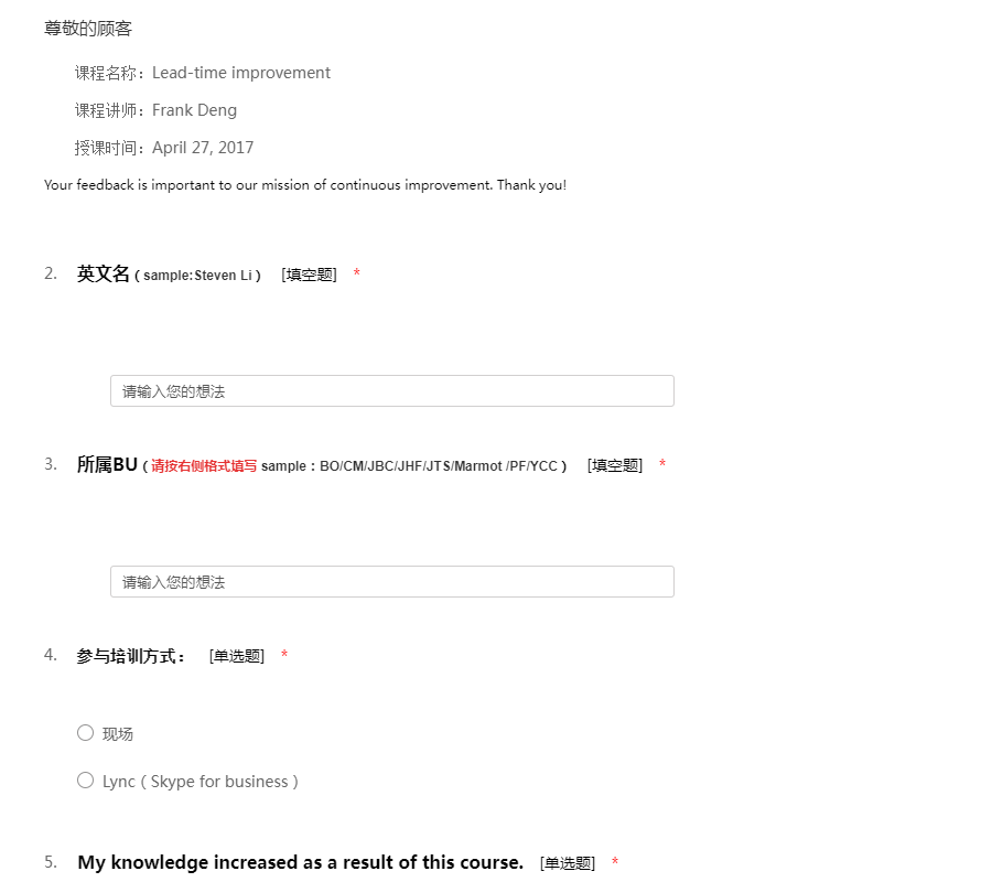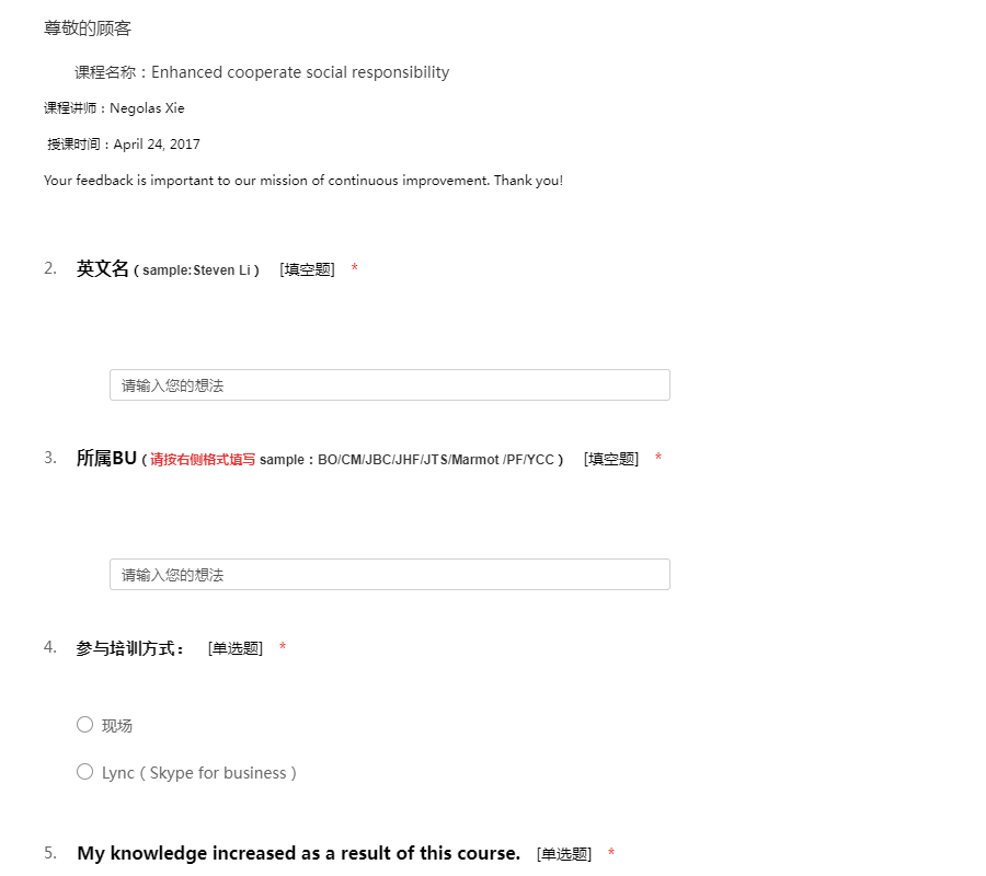 各位同仁,大家好!感谢您参加本次的培训课程。为了解您对本次课程的满意程度,请您尽可能地准确、详尽填写以下的问卷,您的意见和建议有助于我们不断地完善培训课程及培训体系。以下您所提供的信息仅会应用于此。非常感谢您的配合!