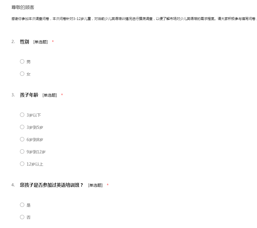 感谢你参加本次调查问卷,本次问卷针对3-12岁儿童,对当前少儿英语培训情况进行摸底调查,以便了解市场对少儿英语培的需求程度。请大家积极参与填写问卷,感谢您的的支持与帮助!