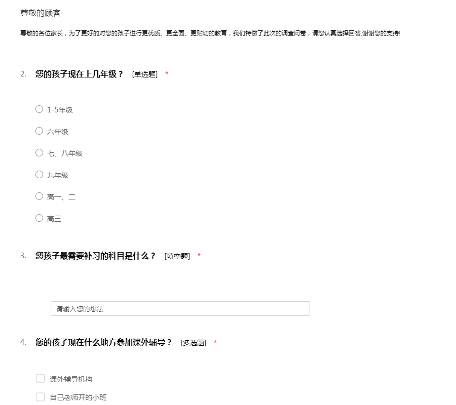 女士/小姐/先生:您好!感谢您参加本次访问。本项目主要了解小学生、初中生和高中生的课外培训现状和需求,以及对在线教育平台/工具的使用情况和需求,您的信息我们将予以保密,请您放心填写。