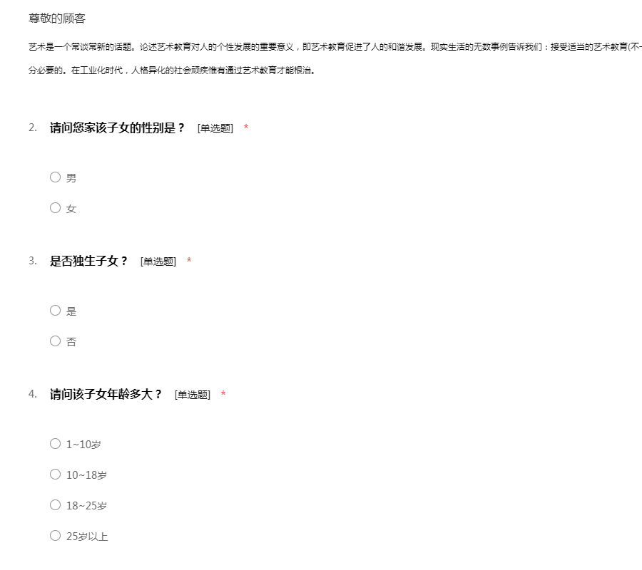 感谢您抽出宝贵的时间来帮助我们完成本次艺术培训家长调查问卷。本次艺术培训家长调查问卷旨在深入了解孩子家长对于文化艺术培训行业的意见建议,非常感谢你回答关于艺术培训家长方面的问题,谢谢你的合作