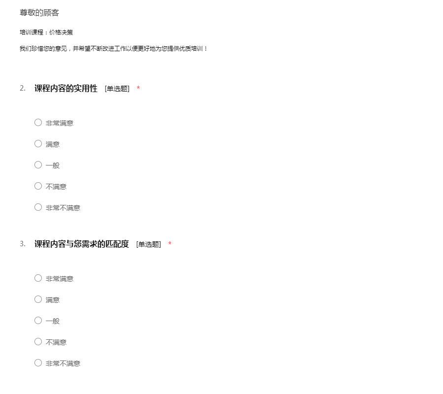 培训课程:价格决策我们珍惜您的意见,并希望不断改进工作以便更好地为您提供优质培训!