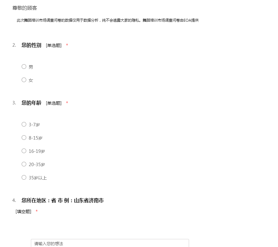 此次舞蹈培训市场调查问卷的数据仅用于数据分析,纯不会透露大家的隐私。舞蹈培训市场调查问卷由EOA提供