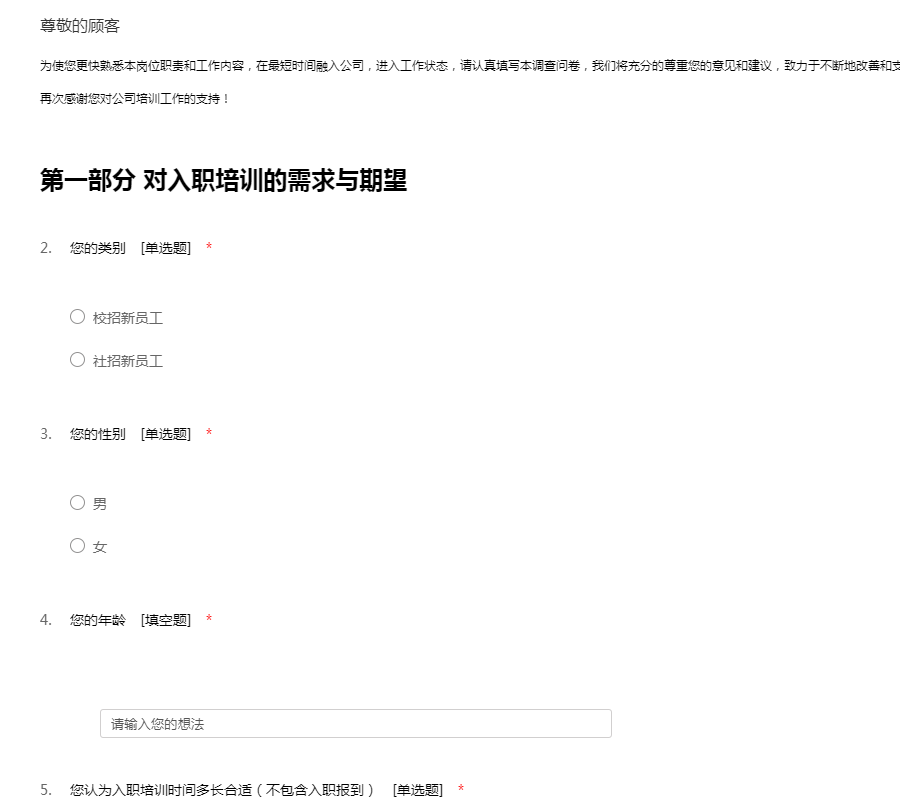 为使您更快熟悉本岗位职责和工作内容,在最短时间融入公司,进入工作状态,请认真填写本调查问卷,我们将充分的尊重您的意见和建议,致力于不断地改善和支持培训质量和效果,实现员工和企业共同成长,再次感谢您对公司培训工作的支持!