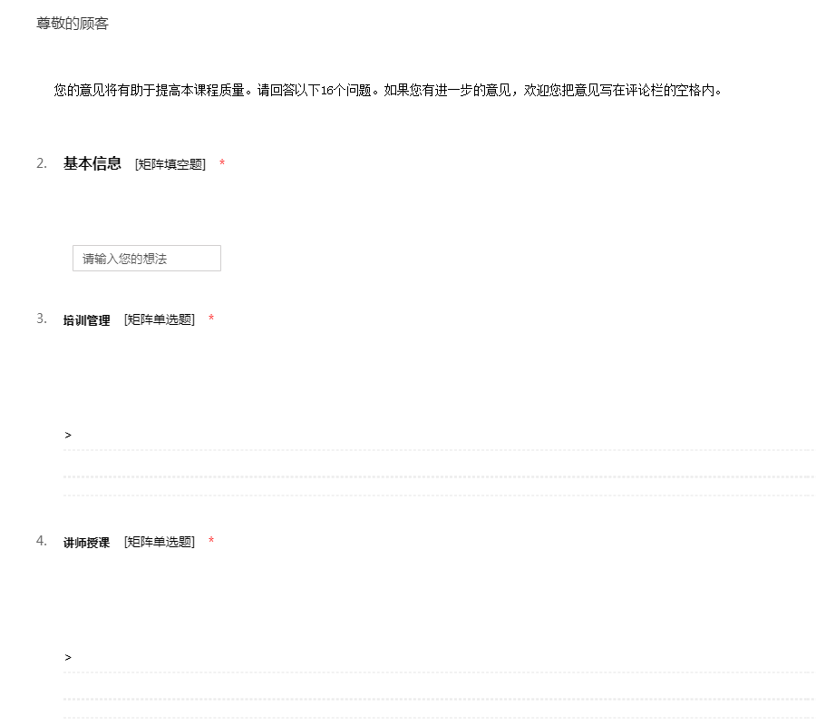 您的意见将有助于提高本课程质量。请回答以下16个问题。如果您有进一步的意见,欢迎您把意见写在评论栏的空格内。