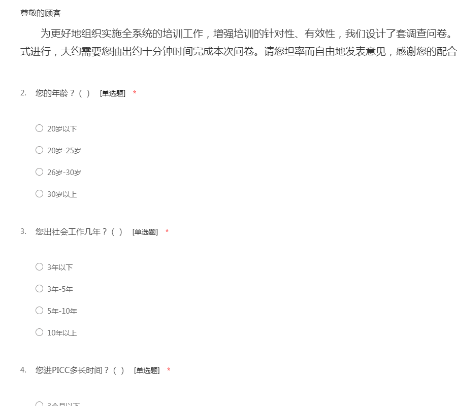 为更好地组织实施全系统的培训工作,增强培训的针对性、有效性,我们设计了套调查问卷。此次问卷调查采取匿名的方式进行,大约需要您抽出约十分钟时间完成本次问卷。请您坦率而自由地发表意见,感谢您的配合与支持!