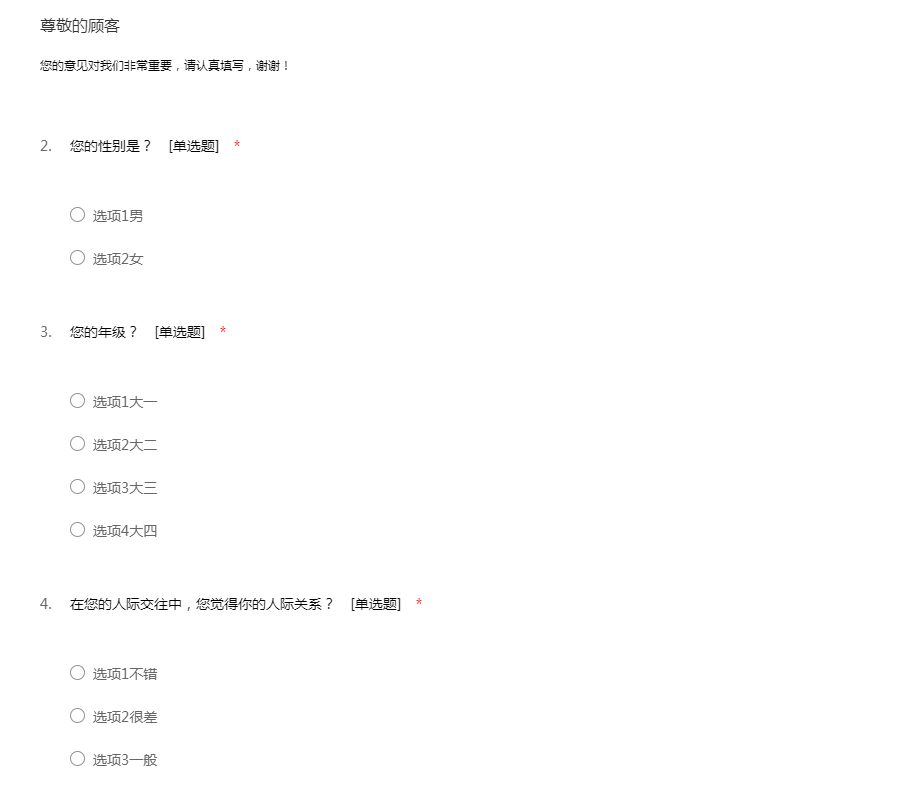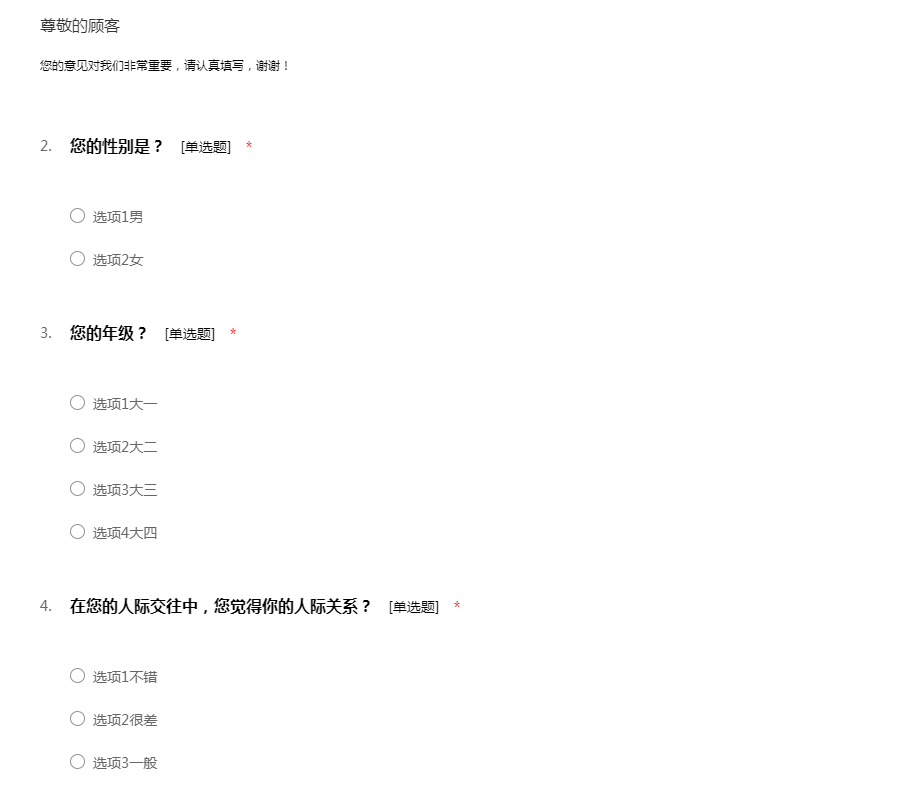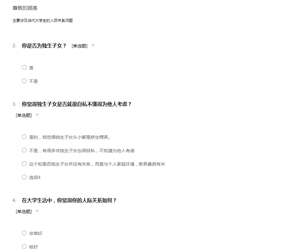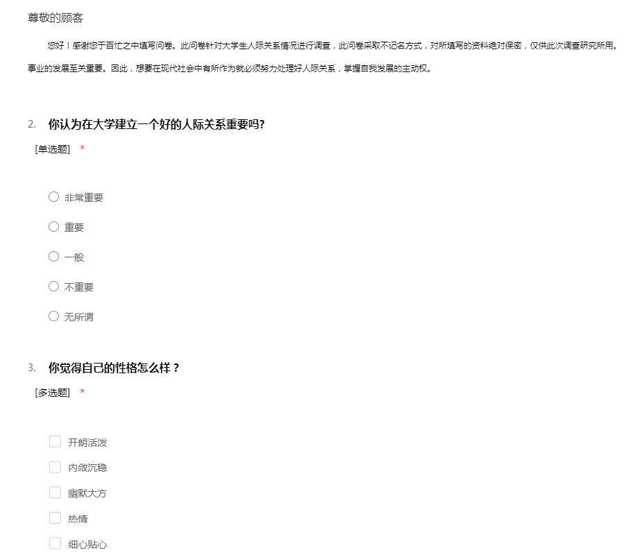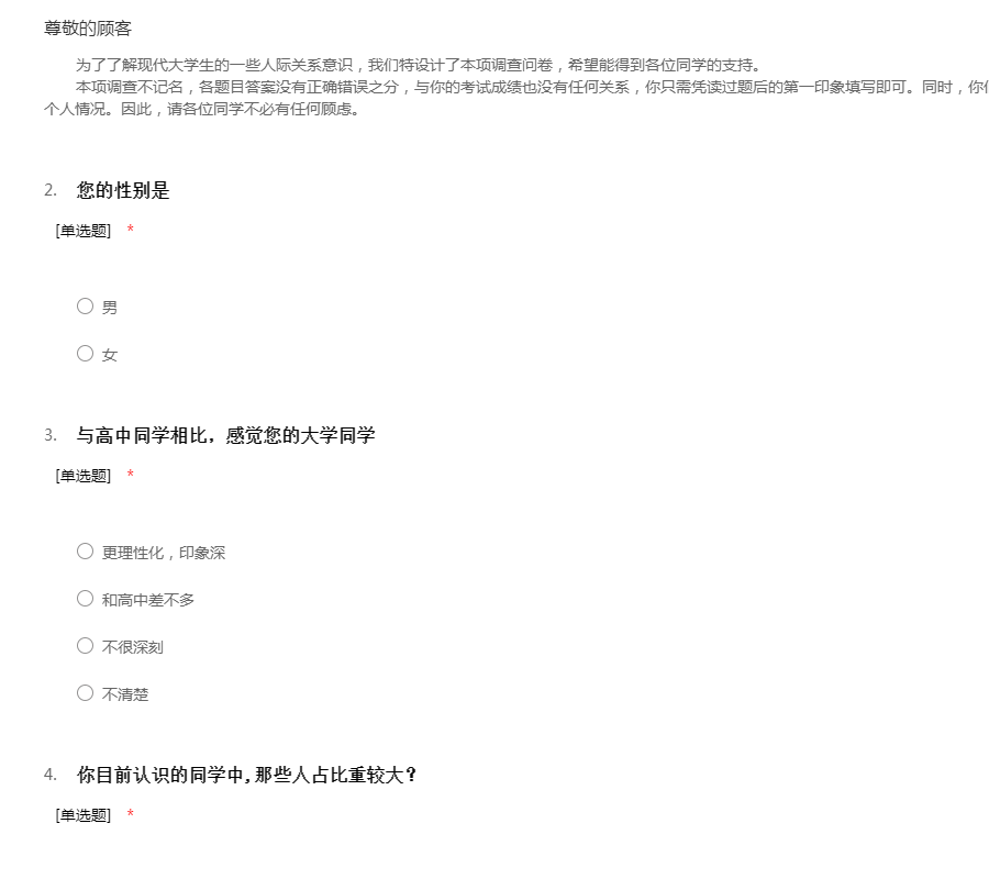 感谢您参与“大学生人际关系调查问卷”,此次调查旨在了解大学生如何处理好人际关系,调查所得的结果对您的工作和生活不会带来任何不良影响,请您根据自己的实际情况放心填写,51调查网感谢您的配合!