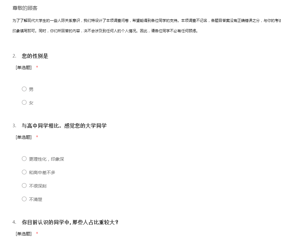 对于一名大学生来说,大学是人际关系走向社会化的一个重要转折时期。踏入大学,就会遇到各方面的人际关系:师生之间、同学之间、同乡之间,以及个人与班级、学校之间的关系等等。如何处理好人际关系,对于大学生的大学生活和未来事业,至关重要。本问卷采取不记名方式。对所填写的资料绝对保密,只作为我们此次调查研究所用。感谢你抽空填写问卷……