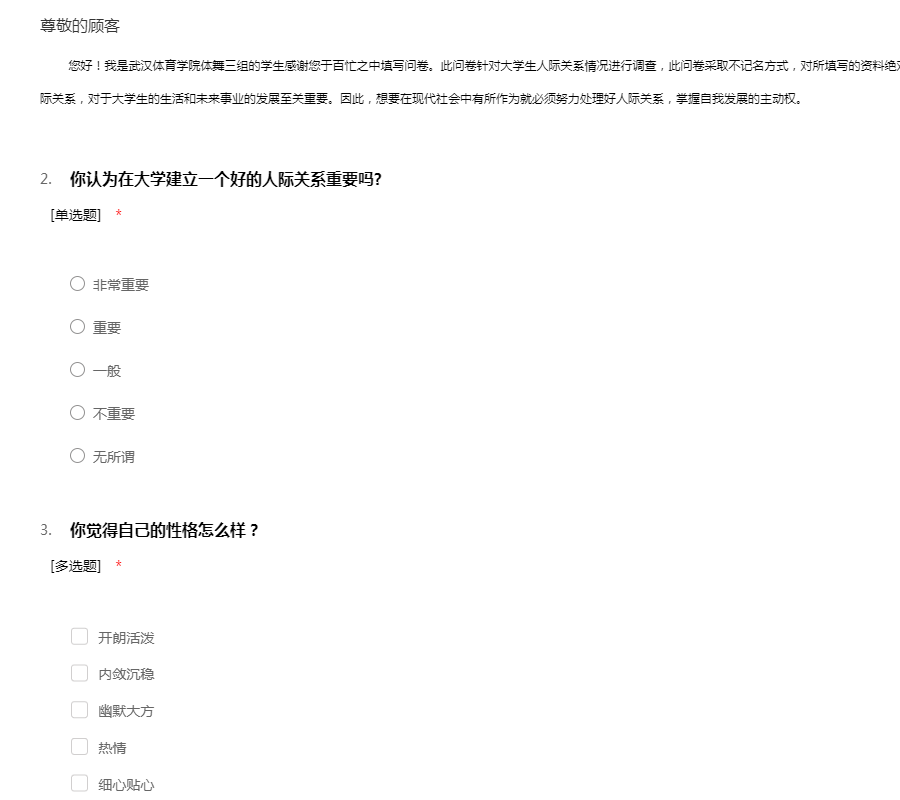 您好!我是武汉体育学院体舞三组的学生感谢您于百忙之中填写问卷。此问卷针对大学生人际关系情况进行调查,此问卷采取不记名方式,对所填写的资料绝对保密,仅供此次调查研究所用。 如何处理好人际关系,对于大学生的生活和未来事业的发展至关重要。因此,想要在现代社会中有所作为就必须努力处理好人际关系,掌握自我发展的主动权。