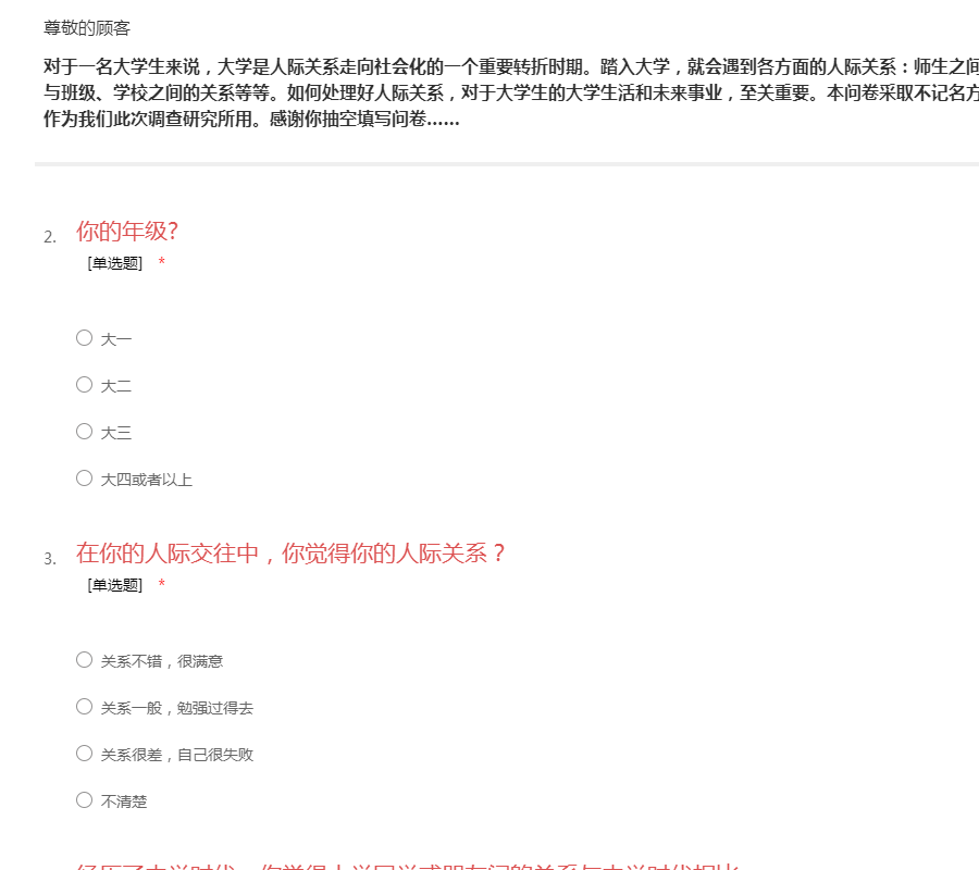 您好!感谢您于百忙之中填写问卷。此问卷针对大学生人际关系情况进行调查,此问卷采取不记名方式,对所填写的资料绝对保密,仅供此次调查研究所用。 如何处理好人际关系,对于大学生的生活和未来事业的发展至关重要。因此,想要在现代社会中有所作为就必须努力处理好人际关系,掌握自我发展的主动权。