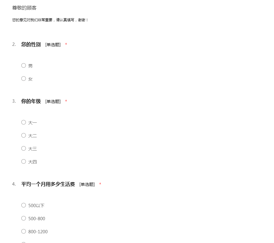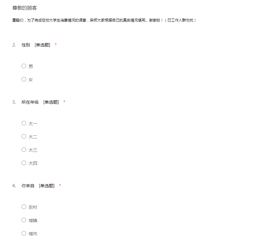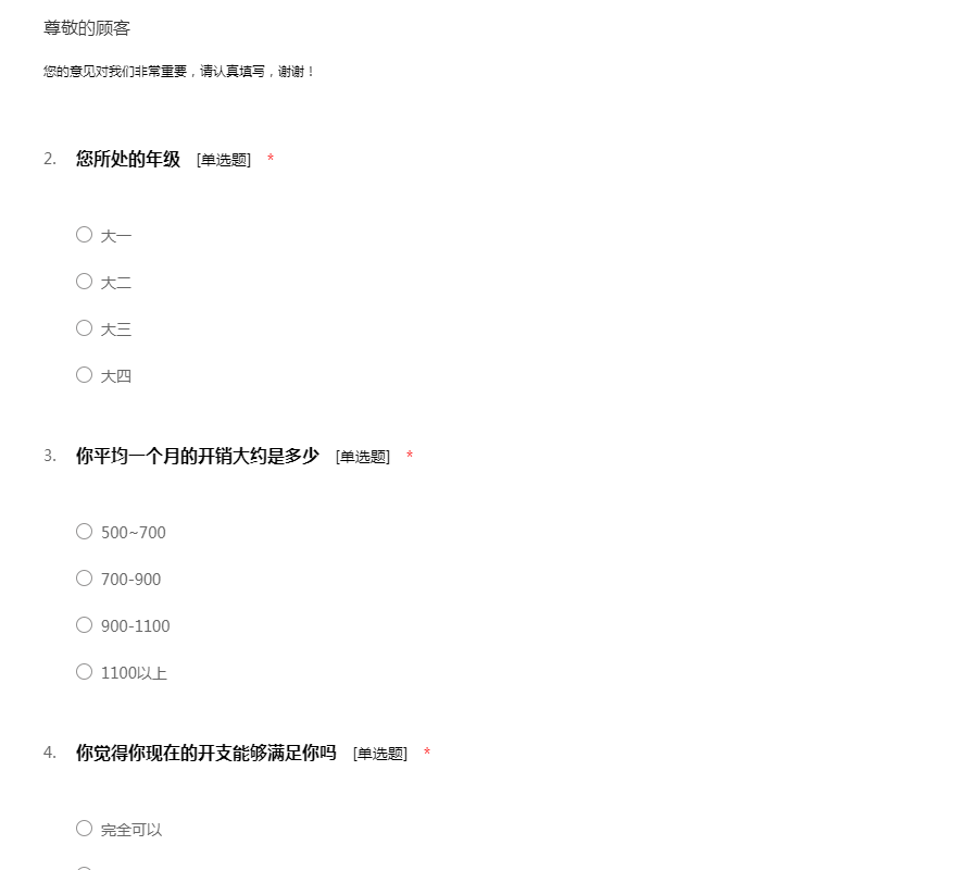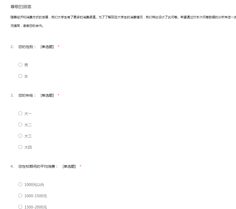 随着经济和消费方式的发展,我们大学生有了更多的消费渠道。为了了解现在大学生的消费情况,我们特此设计了此问卷。希望通过对本次问卷数据的分析来进一步了解大学生的消费情况,希望您根据您的真实情况填写,谢谢您的合作。