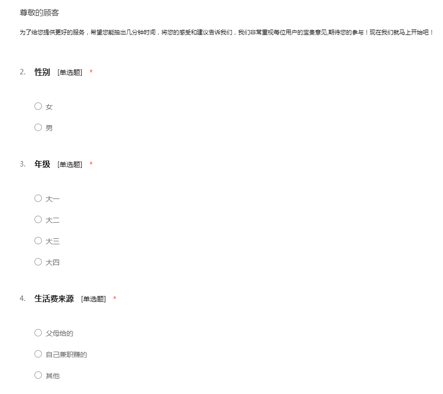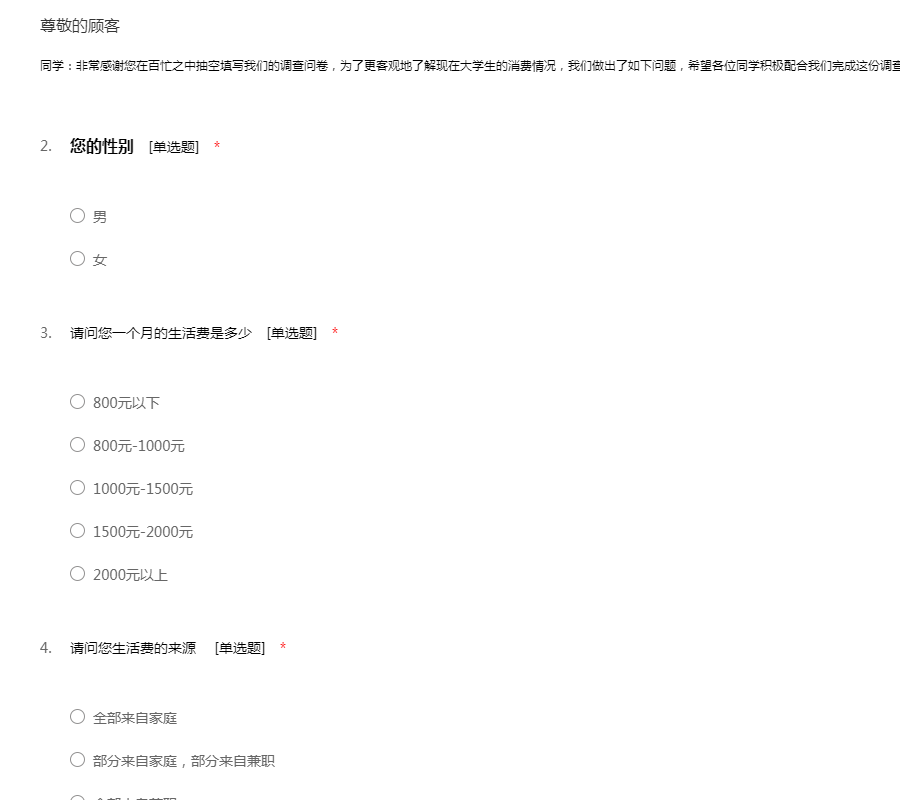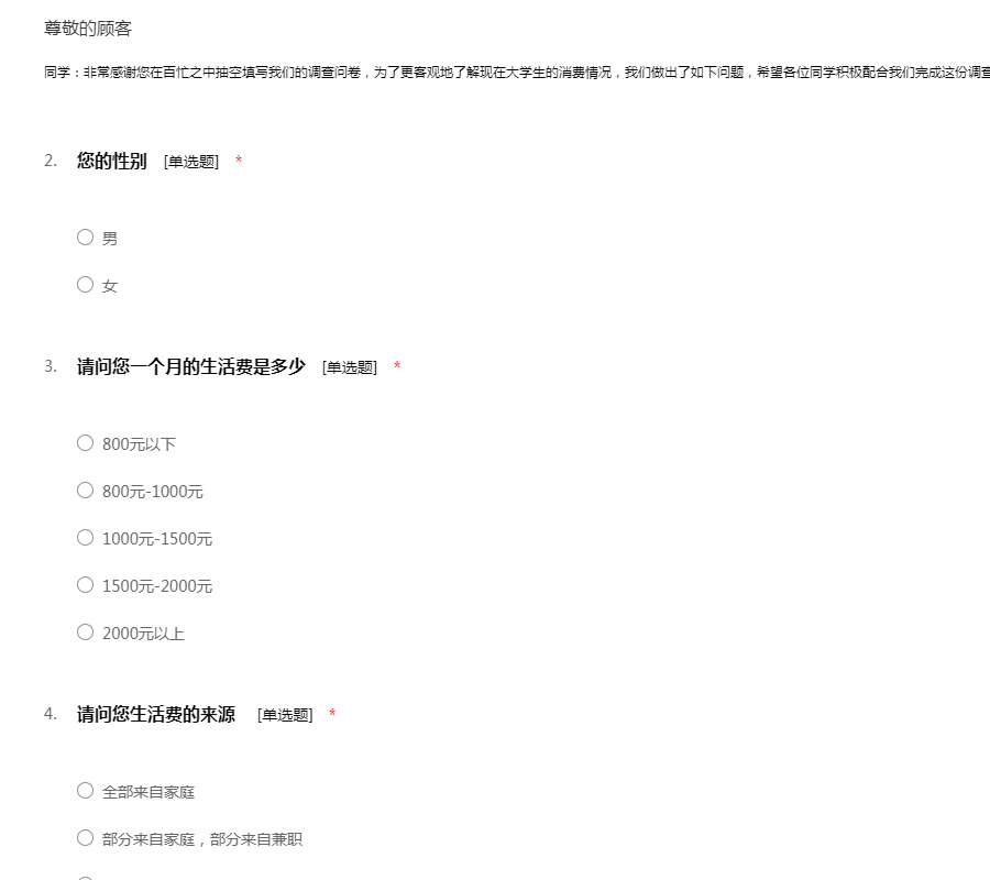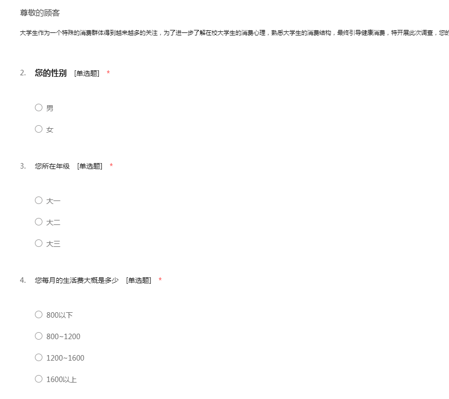 您好,谢谢您参加我们这次关于大学生消费情况的调查!本次调查只需要占用您几分钟的时间。为了研究大学生作为社会的一种特殊的消费群体,我们通过这次的问卷调查,希望可以从中总结出大学生的消费心理特征和行动向导,从而更好的帮助大学生做好理财规划,帮助大学生养成一个健康的消费观念。