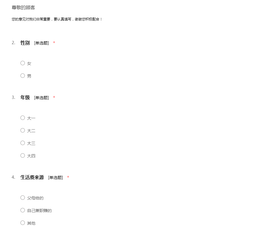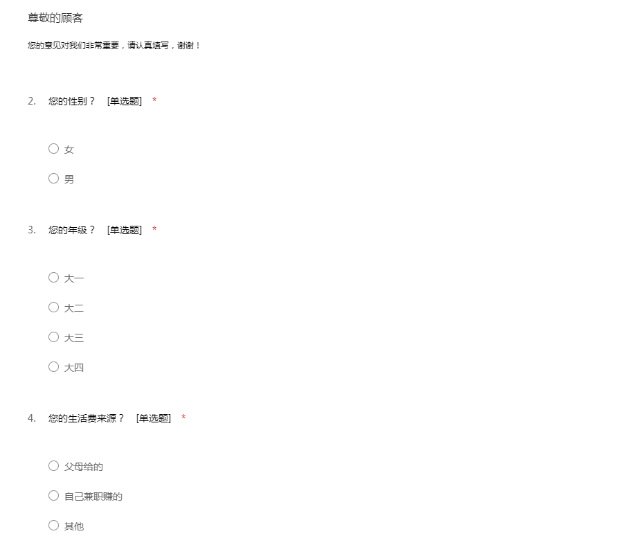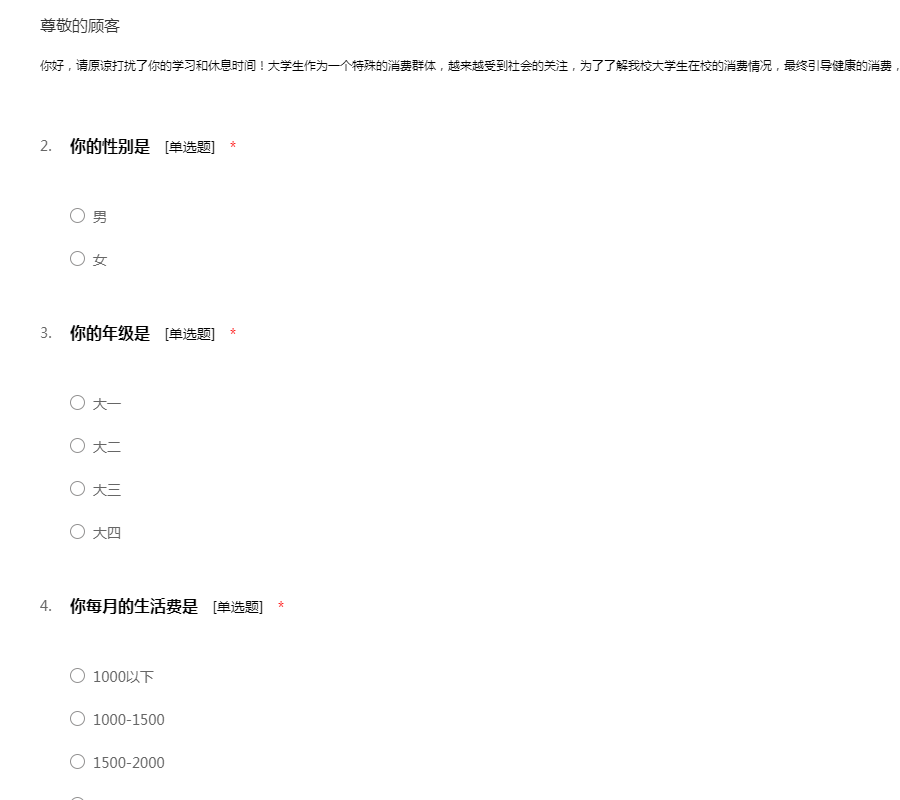 同学:非常感谢您在百忙之中抽空填写我们的调查问卷,为了更客观地了解现在大学生的消费情况,我们做出了如下问题,希望各位同学积极配合我们完成这份调查问卷。