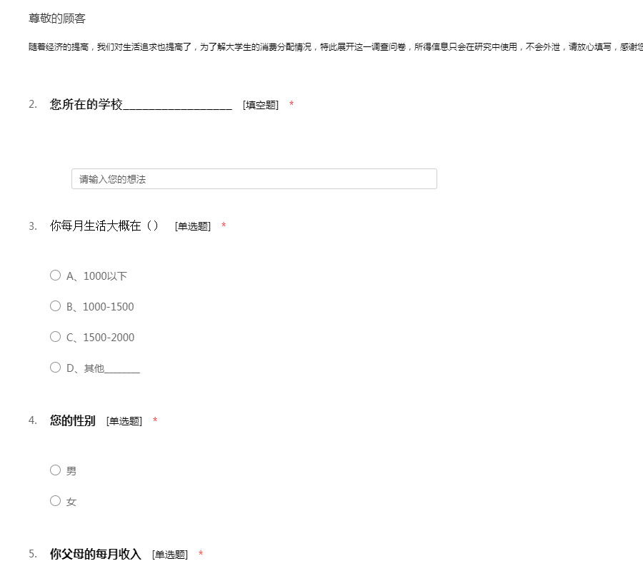 为了解目前大学生在金钱观,消费观,消费与闲暇关系,理财素质等方面的现状,为研究大学生时尚消费提供更多依据,我们举办了此次调查,特邀你参加此次调查。我们将对您的回答予以保密,我们期待能收到您填写完整的问卷,谢谢。