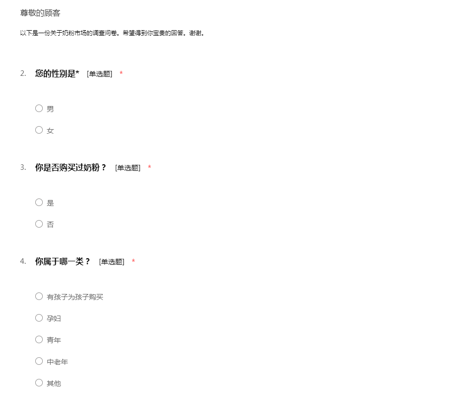 以下是一份关于奶粉市场的调查问卷。希望得到你宝贵的回答。谢谢。