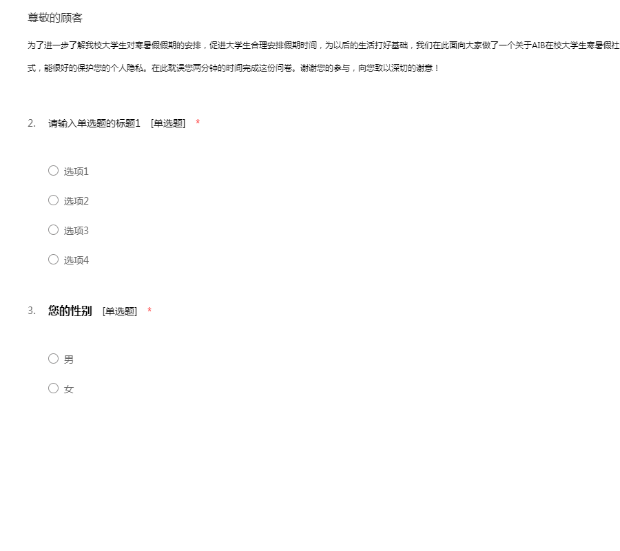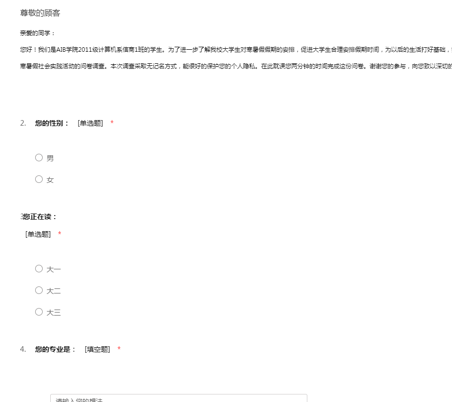 亲爱的同学: 您好!我们是AIB学院2011级计算机系信商1班的学生。为了进一步了解我校大学生对寒暑假假期的安排,促进大学生合理安排假期时间,为以后的生活打好基础,我们在此面向大家做了一个关于AIB在校大学生寒暑假社会实践活动的问卷调查。本次调查采取无记名方式,能很好的保护您的个人隐私。在此耽误您两分钟的时间完成这份问卷。谢谢您的参与,向您致以深切的谢意!