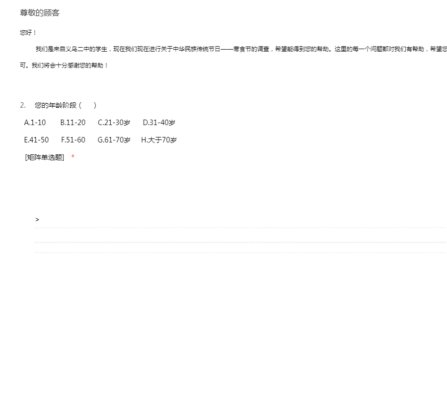 您好! 我们是来自义乌二中的学生,现在我们现在进行关于中华民族传统节日——寒食节的调查,希望能得到您的帮助。这里的每一个问题都对我们有帮助,希望您能够认真作答,您只需将问卷中的选项选出即可。我们将会十分感谢您的帮助!
