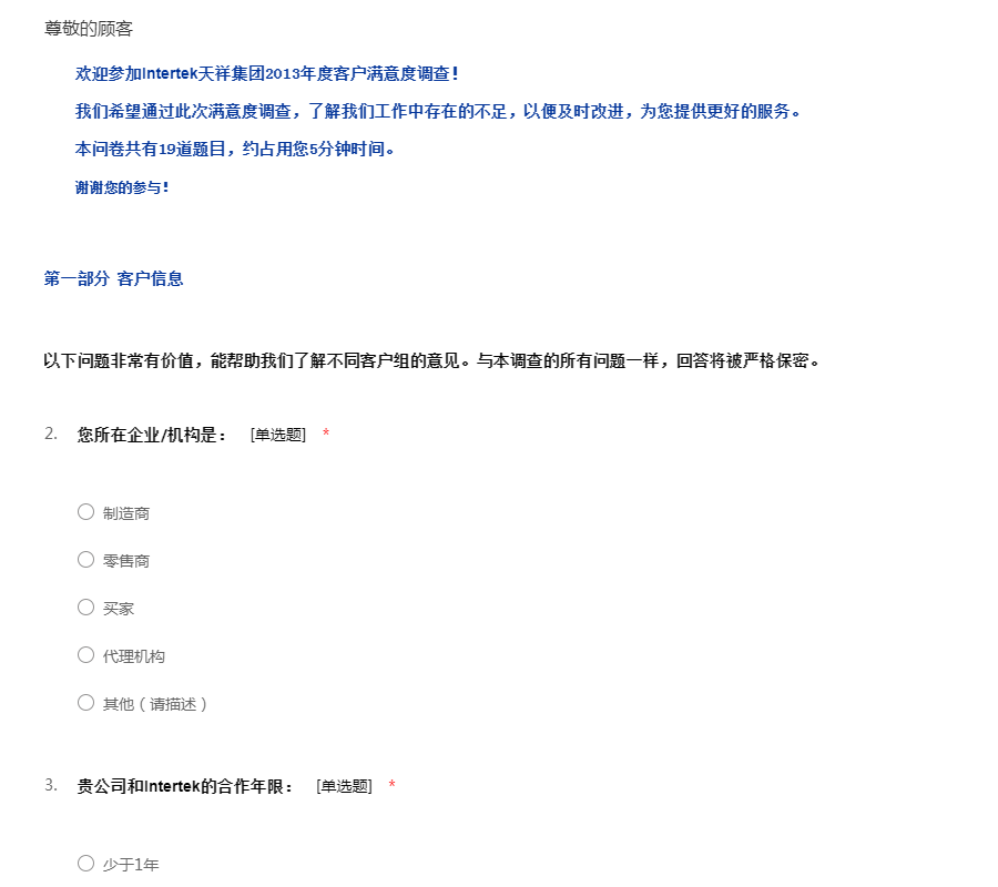 欢迎参加Intertek天祥集团2013年度客户满意度调查! 我们希望通过此次满意度调查,了解我们工作中存在的不足,以便及时改进,为您提供更好的服务。 本问卷共有19道题目,约占用您5分钟时间。 谢谢您的参与!