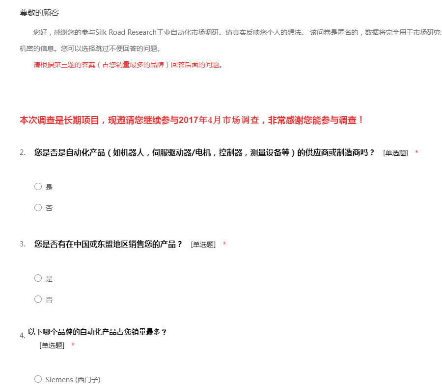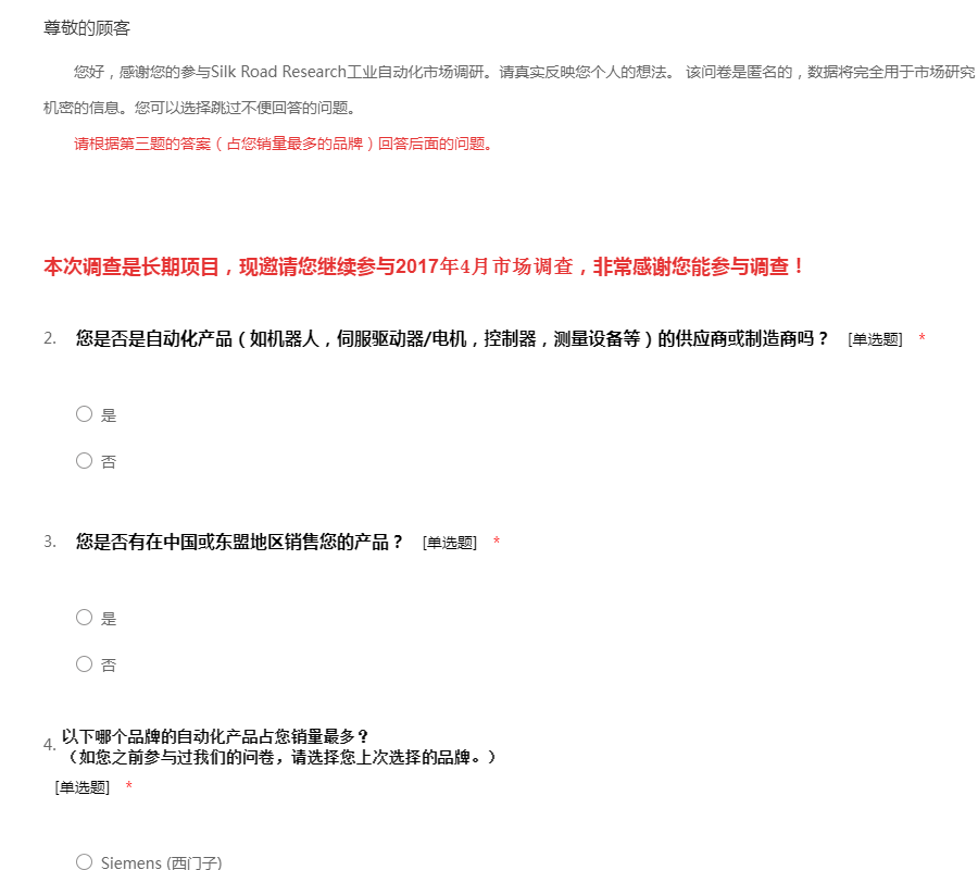 您好,感谢您的参与Silk Road Research工业自动化市场调研。请真实反映您个人的想法。 该问卷是匿名的,数据将完全用于市场研究,并得到严格保密。请勿泄露任何敏感或机密的信息。您可以选择跳过不便回答的问题。 请根据第三题的答案(占您销量最多的品牌)回答后面的问题。