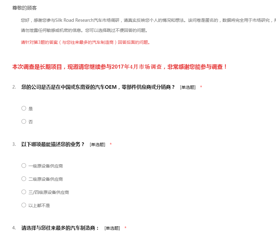 汽车供应商2017年4月市场调查问卷