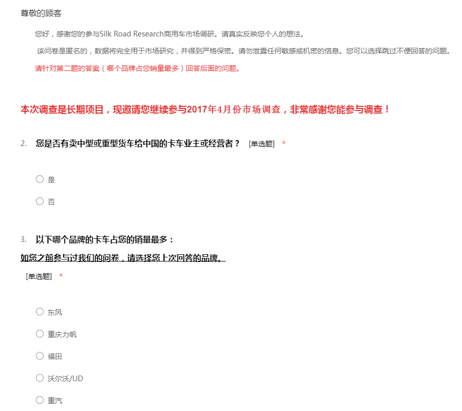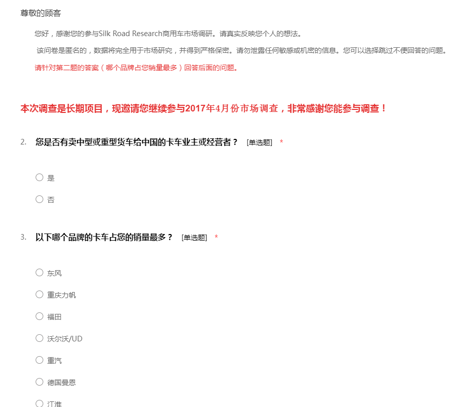 您好,感谢您的参与Silk Road Research商用车市场调研。请真实反映您个人的想法。 该问卷是匿名的,数据将完全用于市场研究,并得到严格保密。请勿泄露任何敏感或机密的信息。您可以选择跳过不便回答的问题。 请针对第二题的答案(哪个品牌占您销量最多)回答后面的问题。