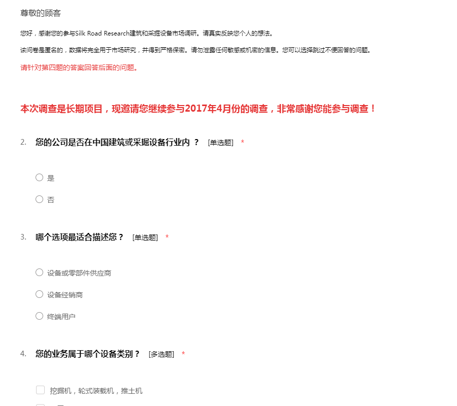 建筑与采掘设备2017年4月份市场调查问卷