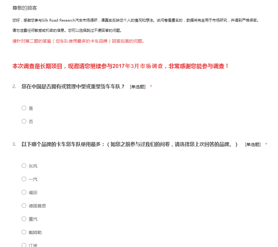 您好,感谢您的参与Silk Road Research商用车市场调研。请真实反映您个人的想法。 该问卷是匿名的,数据将完全用于市场研究,并得到严格保密。请勿泄露任何敏感或机密的信息。您可以选择跳过不便回答的问题。 请针对第二题的答案(哪个品牌占您销量最多)回答后面的问题。