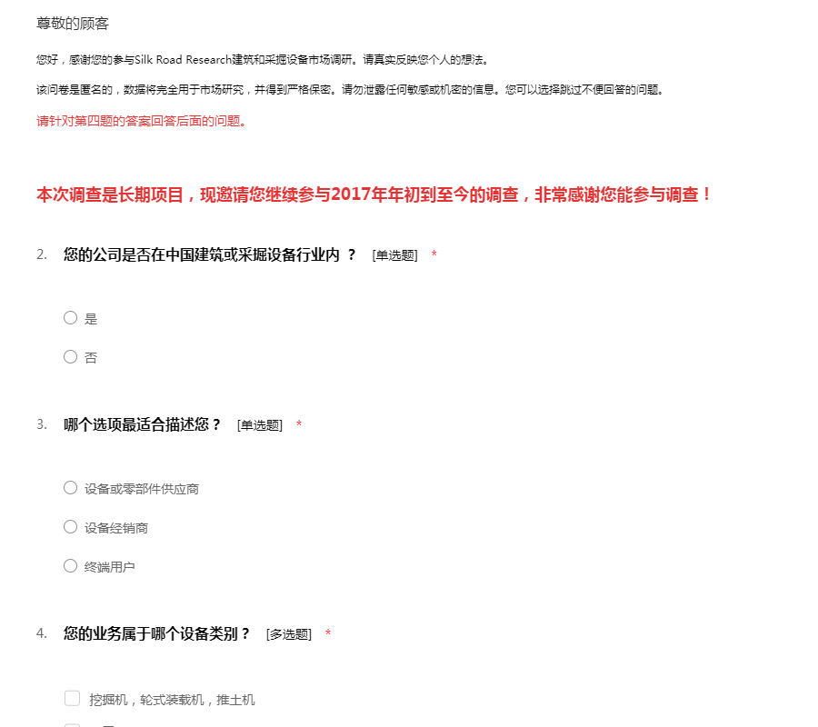 您好,感谢您的参与Silk Road Research建筑和采掘设备市场调研。请真实反映您个人的想法。 该问卷是匿名的,数据将完全用于市场研究,并得到严格保密。请勿泄露任何敏感或机密的信息。您可以选择跳过不便回答的问题。 请针对第四题的答案回答后面的问题。