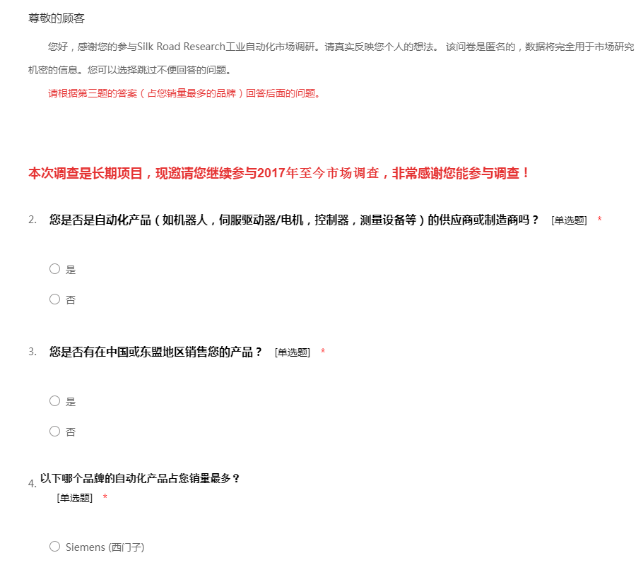 您好,感谢您的参与Silk Road Research工业自动化市场调研。请真实反映您个人的想法。 该问卷是匿名的,数据将完全用于市场研究,并得到严格保密。请勿泄露任何敏感或机密的信息。您可以选择跳过不便回答的问题。 请根据第三题的答案(占您销量最多的品牌)回答后面的问题。