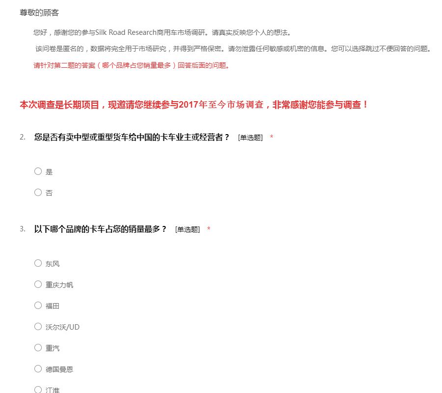 您好,感谢您的参与Silk Road Research商用车市场调研。请真实反映您个人的想法。 该问卷是匿名的,数据将完全用于市场研究,并得到严格保密。请勿泄露任何敏感或机密的信息。您可以选择跳过不便回答的问题。 请针对第二题的答案(哪个品牌占您销量最多)回答后面的问题。