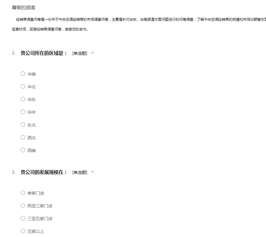 经销商调查问卷是一份关于中央空调经销商的市场调查问卷,主要是针对华东、华南渠道方面问题进行的问卷调查,了解中央空调经销商的规模和市场份额等方面的问题,以此展开问卷调查活动,耽误您一些宝贵时间,回答经销商调查问卷,谢谢您的合作。