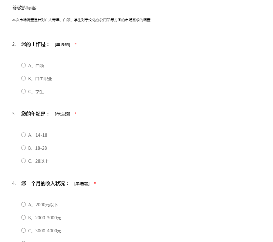 本次市场调查是针对广大青年、白领、学生对于文化办公用品等方面的市场需求的调查