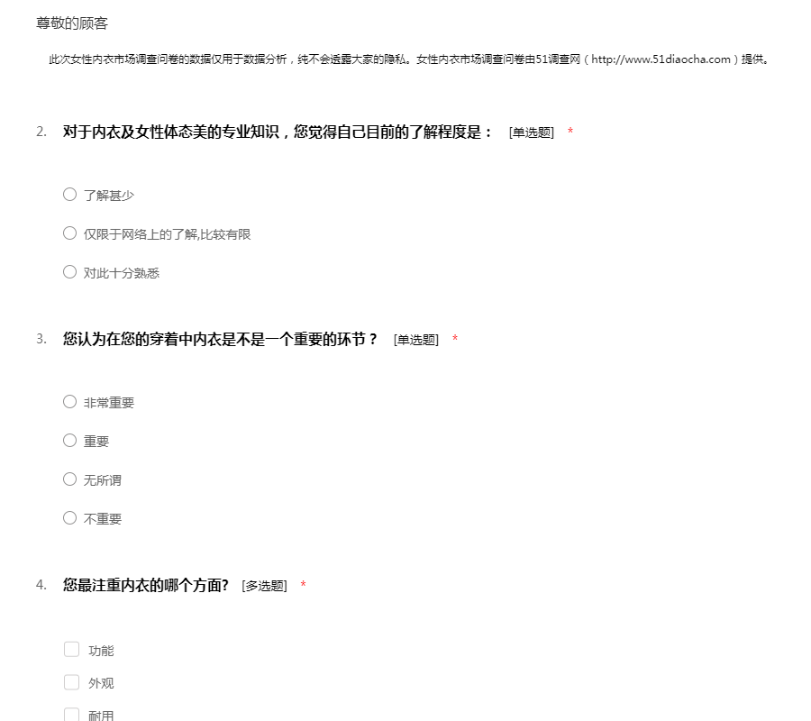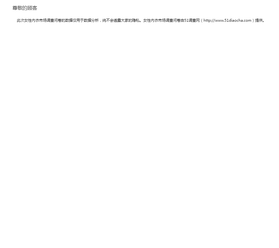 此次女性内衣市场调查问卷的数据仅用于数据分析,纯不会透露大家的隐私。女性内衣市场调查问卷由51调查网(http://www.51diaocha.com)提供。