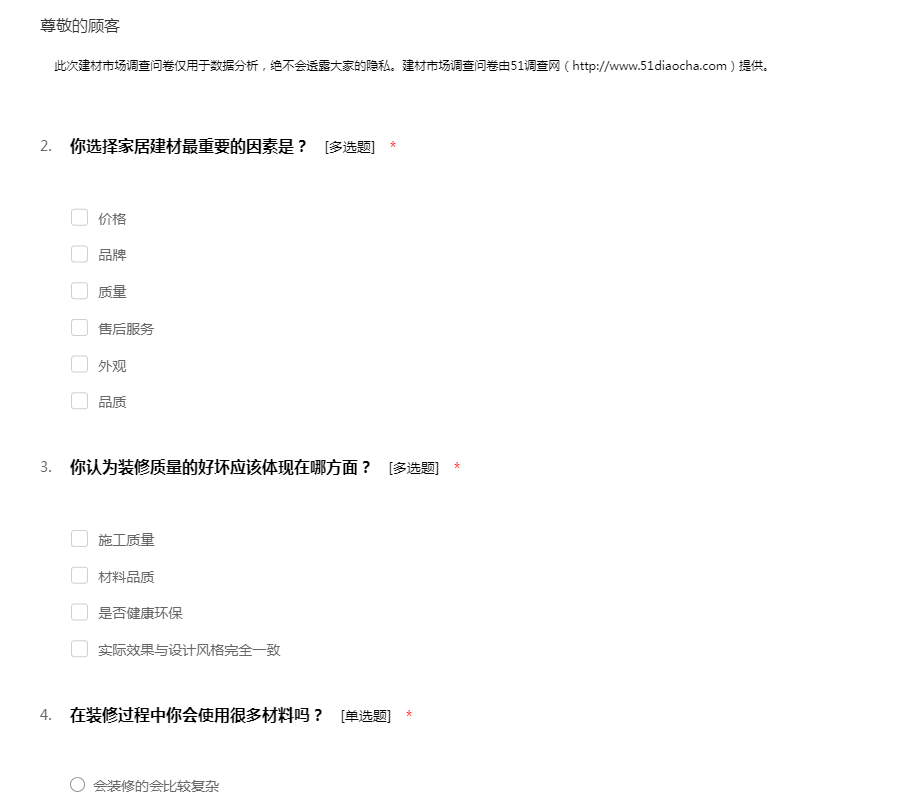 此次建材市场调查问卷仅用于数据分析,绝不会透露大家的隐私。建材市场调查问卷由51调查网(http://www.51diaocha.com)提供。