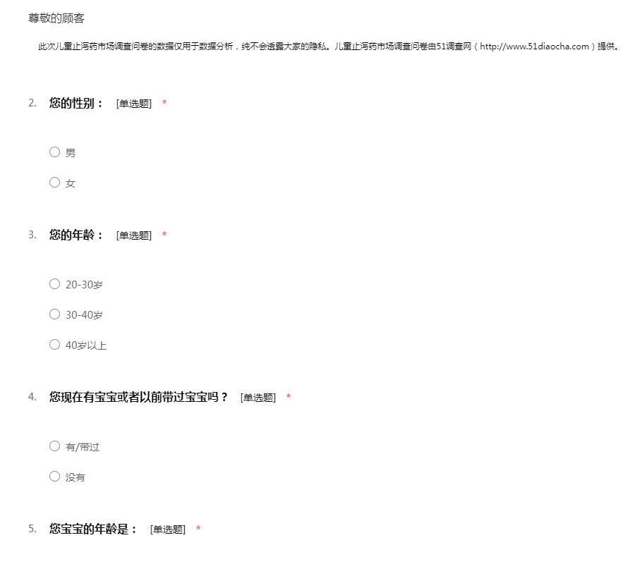 此次儿童止泻药市场调查问卷的数据仅用于数据分析,纯不会透露大家的隐私。儿童止泻药市场调查问卷由51调查网(http://www.51diaocha.com)提供。