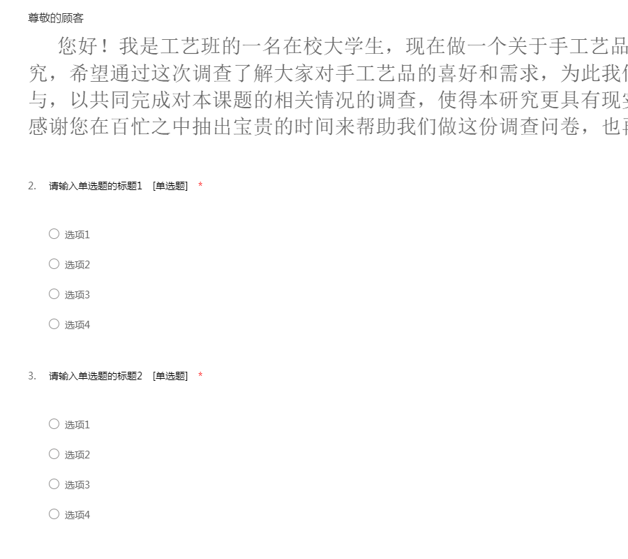 您好!我是工艺班的一名在校大学生,现在做一个关于手工艺品的市场调查课题研究,希望通过这次调查了解大家对手工艺品的喜好和需求,为此我们需要您的帮助与参与,以共同完成对本课题的相关情况的调查,使得本研究更具有现实和实践价值,非常感谢您在百忙之中抽出宝贵的时间来帮助我们做这份调查问卷,也再次感谢您的合作!
