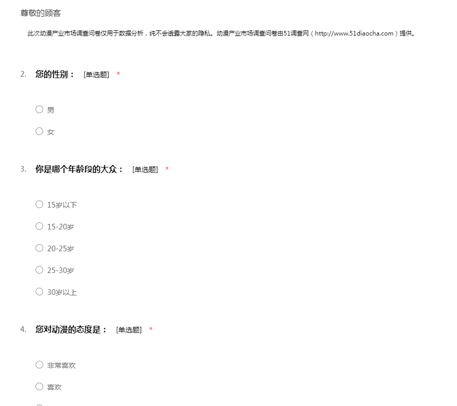 此次动漫产业市场调查问卷仅用于数据分析,纯不会透露大家的隐私。动漫产业市场调查问卷由51调查网(http://www.51diaocha.com)提供。