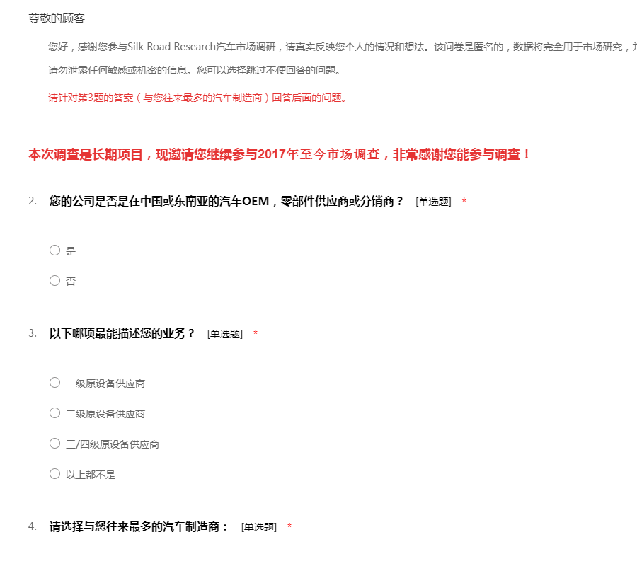 您好,感谢您参与Silk Road Research汽车市场调研,请真实反映您个人的情况和想法。该问卷是匿名的,数据将完全用于市场研究,并得到严格保密。 请勿泄露任何敏感或机密的信息。您可以选择跳过不便回答的问题。 请针对第3题的答案(与您往来最多的汽车制造商)回答后面的问题。