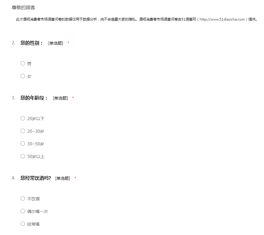 此次酒吧消费者市场调查问卷的数据仅用于数据分析,纯不会透露大家的隐私。酒吧消费者市场调查问卷由51调查网(http://www.51diaocha.com)提供。
