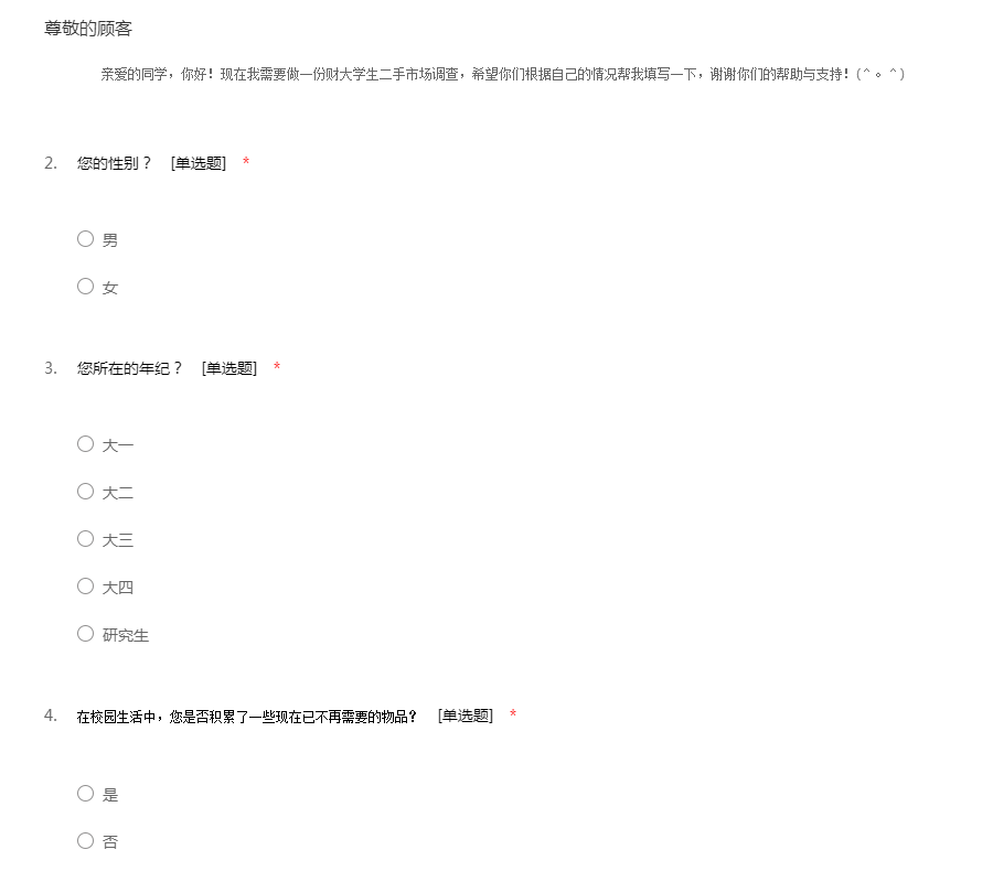 亲爱的同学,你好!现在我需要做一份财大学生二手市场调查,希望你们根据自己的情况帮我填写一下,谢谢你们的帮助与支持!(^。^)