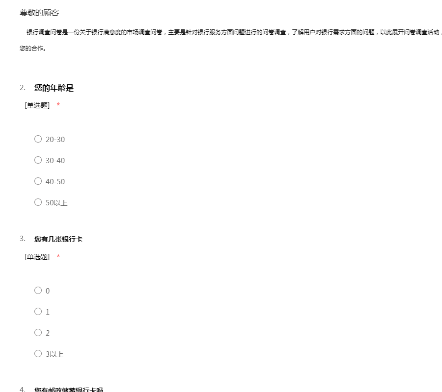银行调查问卷是一份关于银行满意度的市场调查问卷,主要是针对银行服务方面问题进行的问卷调查,了解用户对银行需求方面的问题,以此展开问卷调查活动,耽误您一些宝贵时间,回答我们的问题,谢谢您的合作。