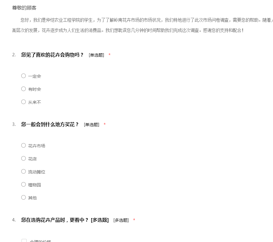 您好,我们是仲恺农业工程学院的学生,为了了解岭南花卉市场的市场状况,我们特地进行了此次市场问卷调查,需要您的帮助。随着人民的生活水平的提高,精神需求正向更高层次的发展,花卉逐步成为人们生活的消费品。我们想耽误您几分钟的时间帮助我们完成这次调查。感谢您的支持和配合!