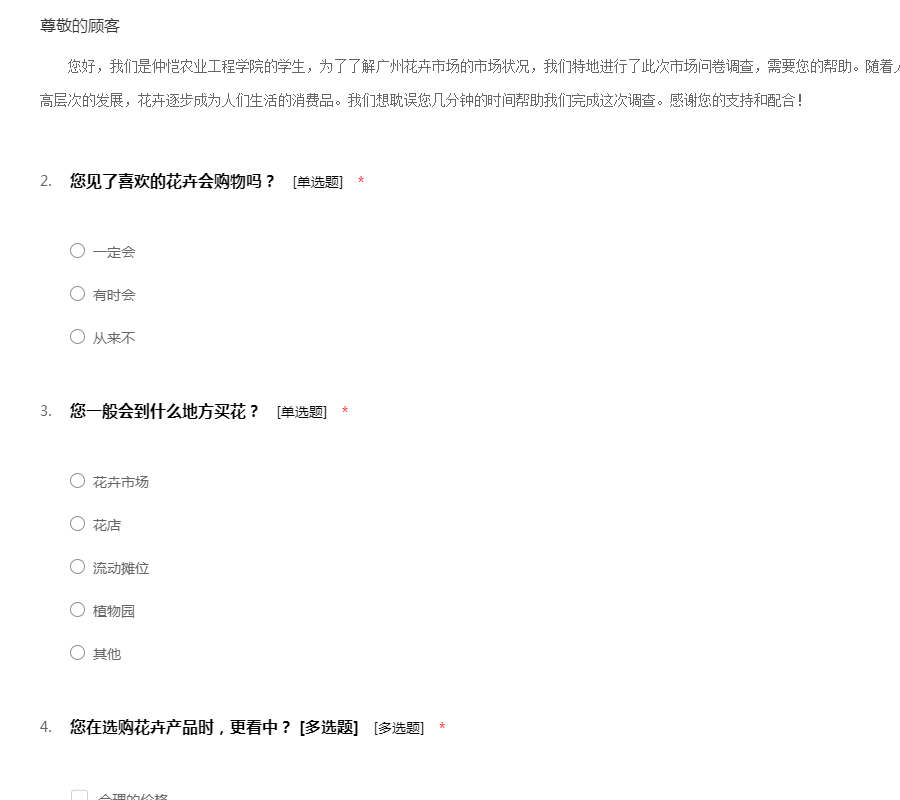 您好,我们是仲恺农业工程学院的学生,为了了解广州花卉市场的市场状况,我们特地进行了此次市场问卷调查,需要您的帮助。随着人民的生活水平的提高,精神需求正向更高层次的发展,花卉逐步成为人们生活的消费品。我们想耽误您几分钟的时间帮助我们完成这次调查。感谢您的支持和配合!