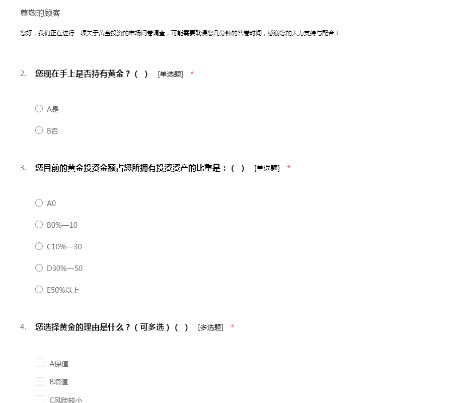 您好,我们正在进行一项关于黄金投资的市场问卷调查,可能需要耽误您几分钟的答卷时间,感谢您的大力支持与配合!