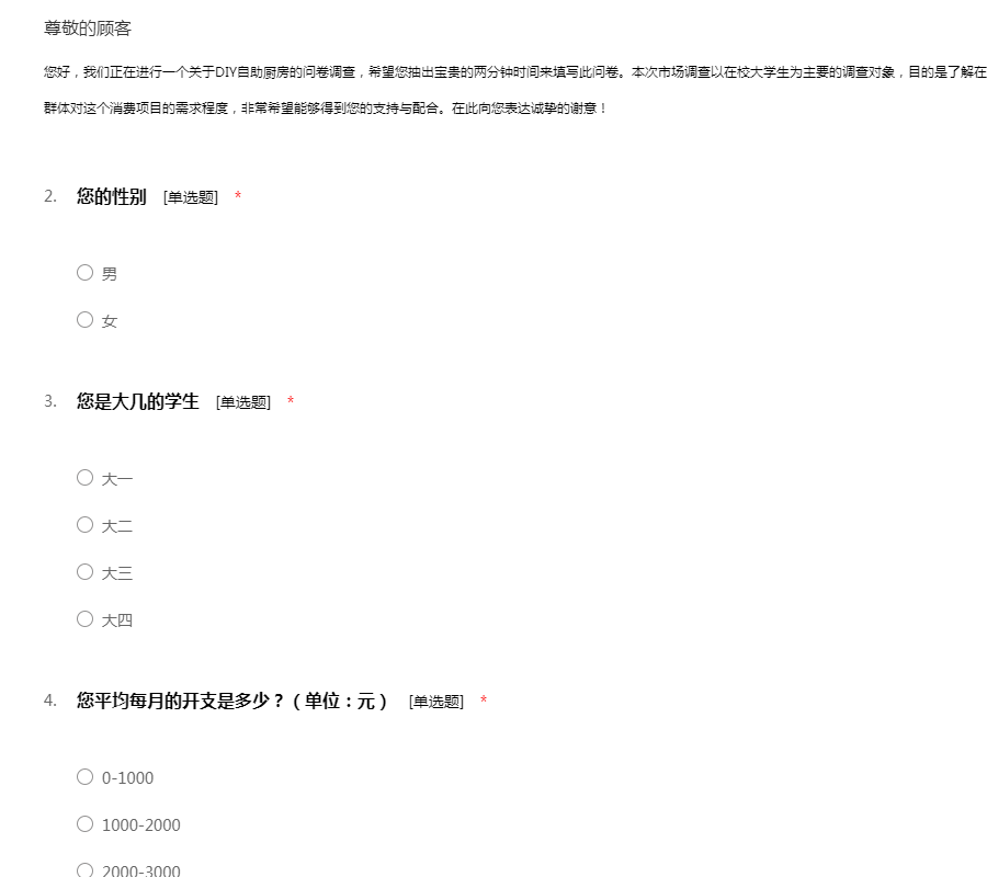 您好,我们正在进行一个关于DIY自助厨房的问卷调查,希望您抽出宝贵的两分钟时间来填写此问卷。本次市场调查以在校大学生为主要的调查对象,目的是了解在校学生对校外DIY自助式厨房的初步看法和这一群体对这个消费项目的需求程度,非常希望能够得到您的支持与配合。在此向您表达诚挚的谢意!