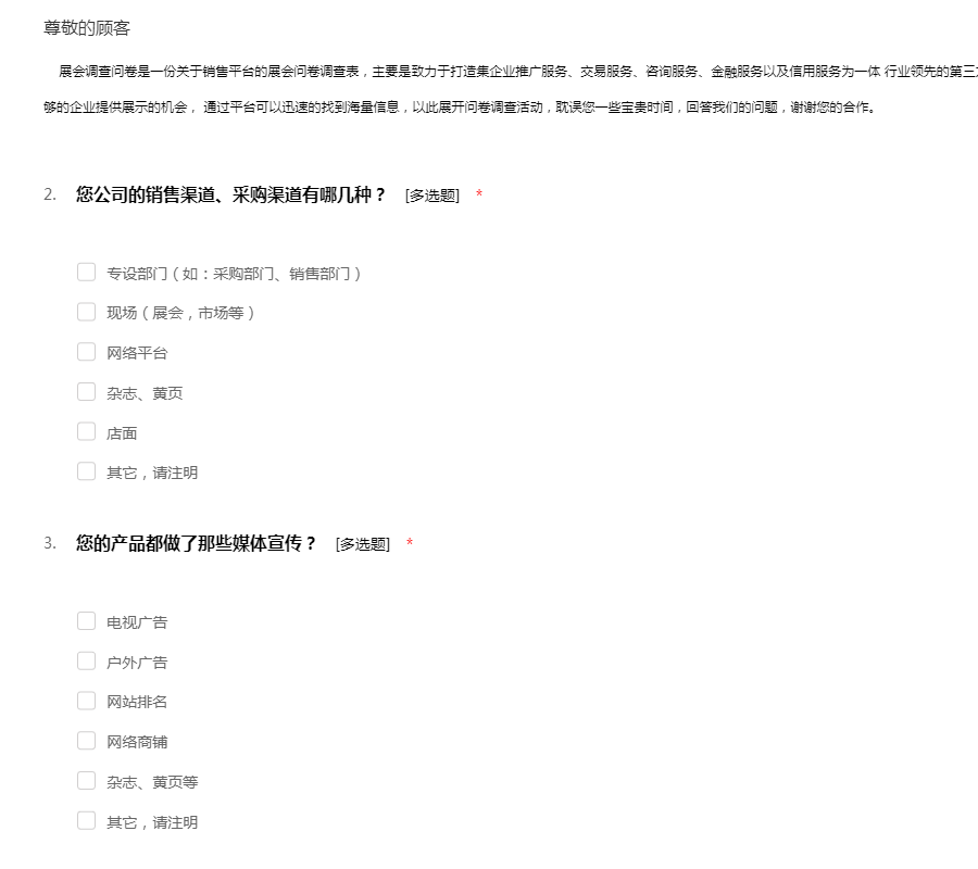 展会调查问卷是一份关于销售平台的展会问卷调查表,主要是致力于打造集企业推广服务、交易服务、咨询服务、金融服务以及信用服务为一体 行业领先的第三方电子商务平台,为那些苦于没有展位或 实力不够的企业提供展示的机会, 通过平台可以迅速的找到海量信息,以此展开问卷调查活动,耽误您一些宝贵时间,回答我们的问题,谢谢您的合作。
